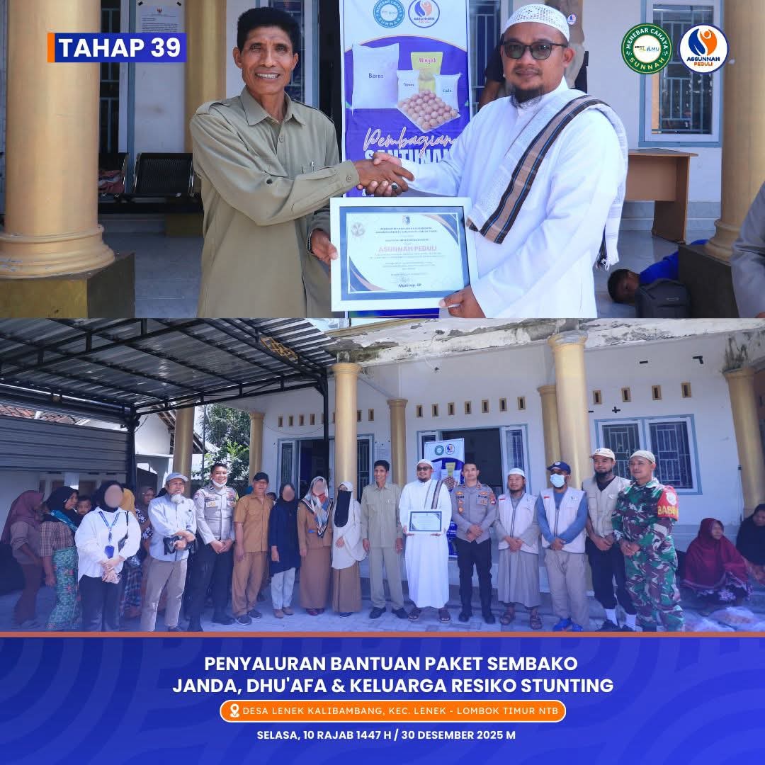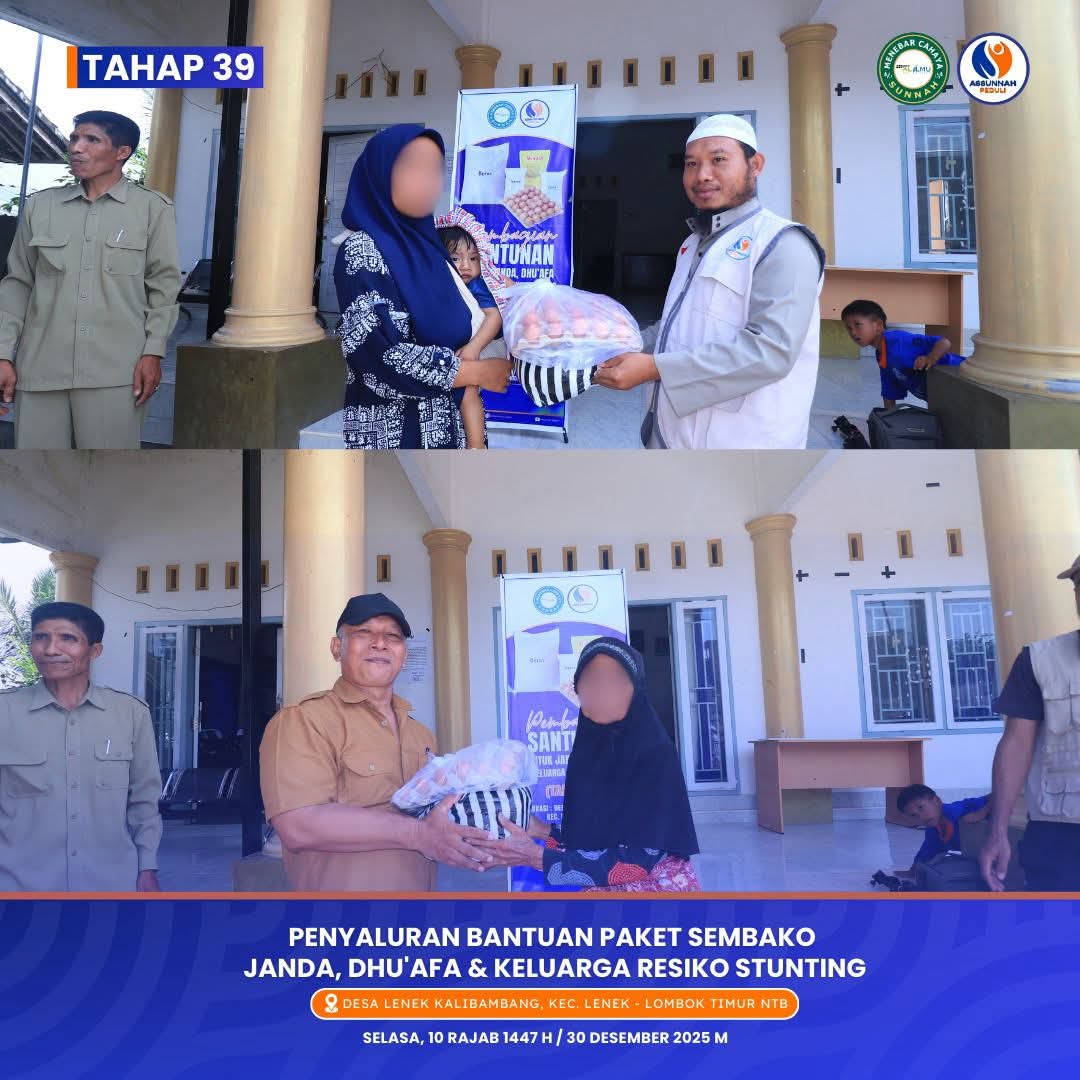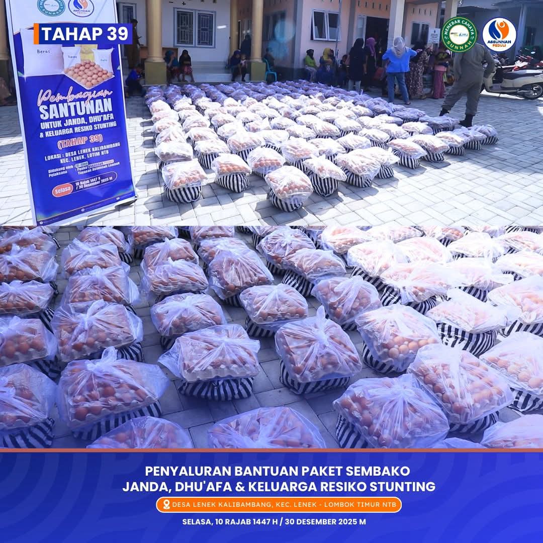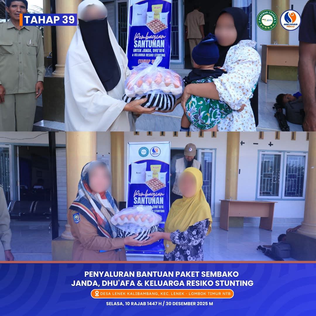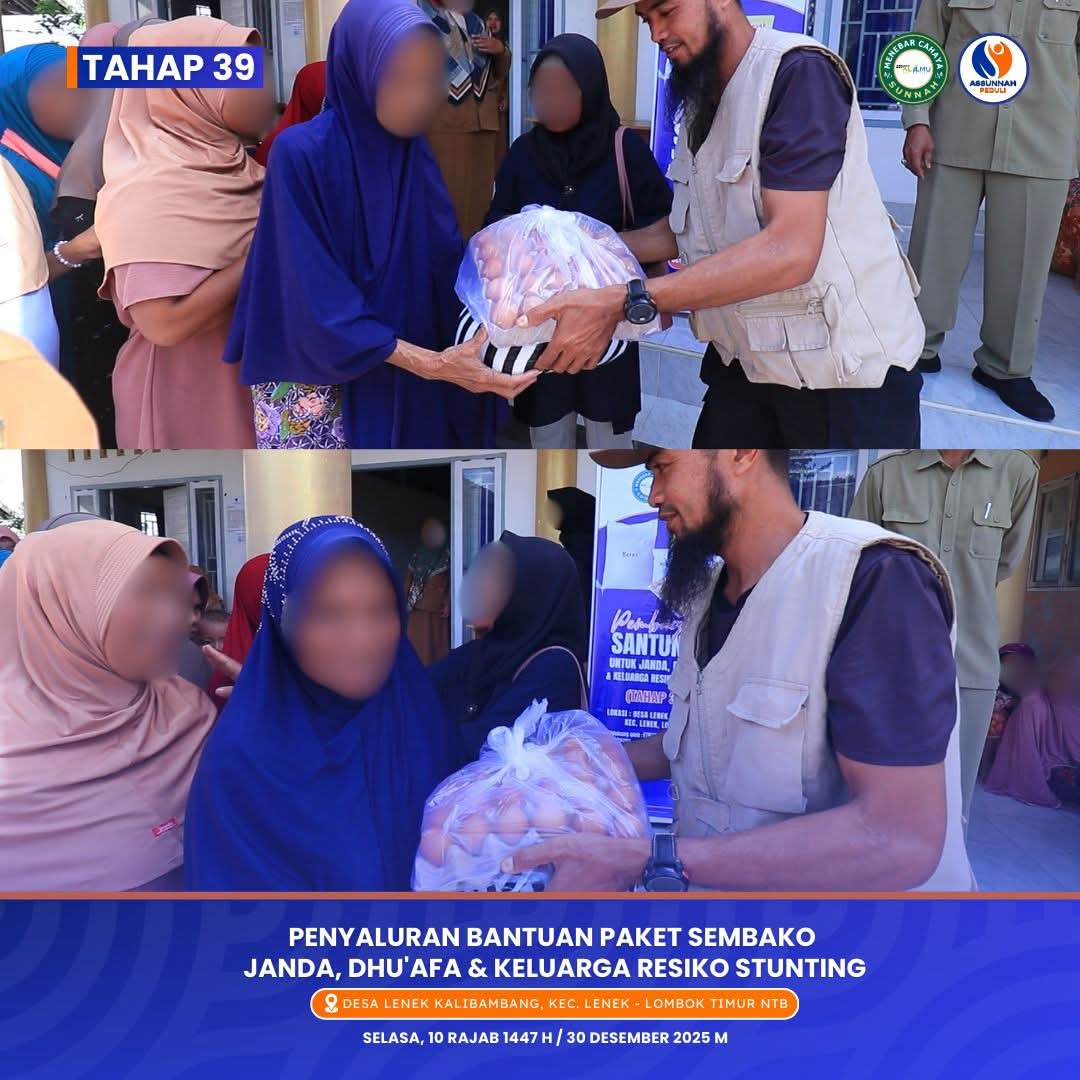 alhamdulillah, terbuka program rutin insyaa Allah santunan bulanan bagi sekitar 125 s/d 150 janda dan dhu’afa (dan keluarga beresiko stunting/KBS), juga termasuk para guru guru agama, TKA, TPA, PAUD yang masuk dalam katagori janda dan kategori miskin, dalam bentuk sembako seperti beras, telur, minyak goreng dll.. Program ini dilaksanakan insyaa Allah bersama posko Assunnah Peduli di wilayah pulau Lombok, NTB.