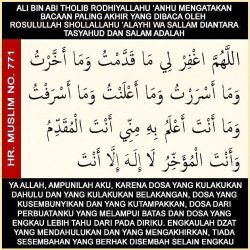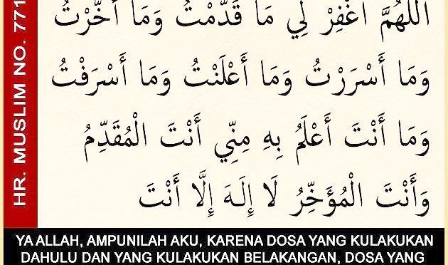 (Ya Allah, ampunilah aku, karena dosa yang kulakukan dahulu dan yang kulakukan belakangan, dosa yang kusembunyikan dan yang kutampakkan, dosa dari perbuatanku yang melampui batas dan dosa yang Engkau lebih tahu daripada diriku. Engkaulah Dzat yang mendahulukan dan yang mengakhirkan, tiada sesembahan yang berhak disembah selain Engkau)