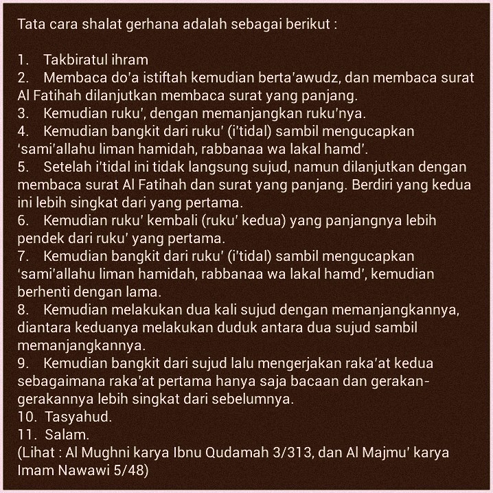 Tata cara sholat gerhana adalah sebagai berikut :