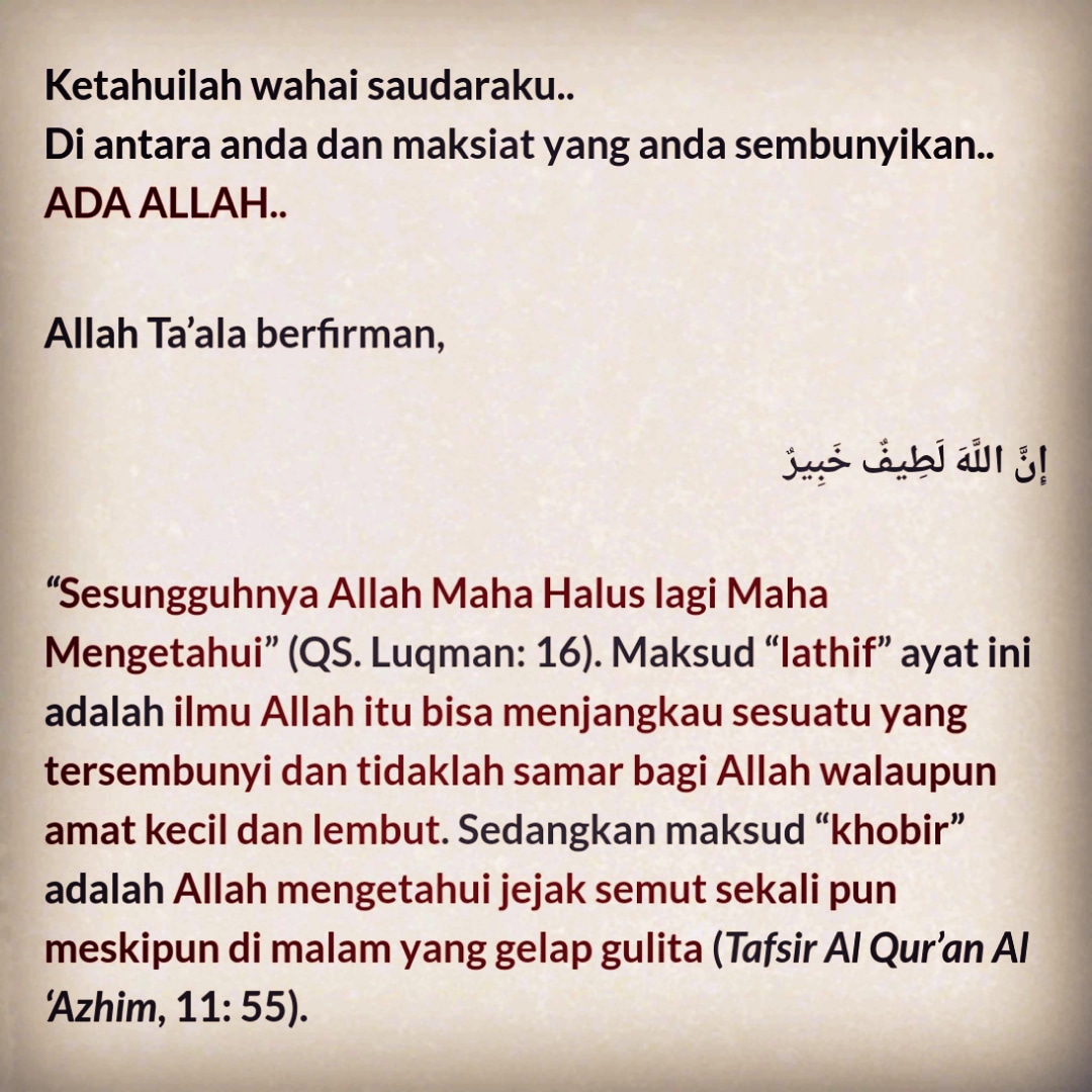 Semoga kita semakin takut kepada Allah di mana pun kita berada. Ingatlah setiap dosa dan kesalahan akan nampak di sisi Allah dan akan dibalas.