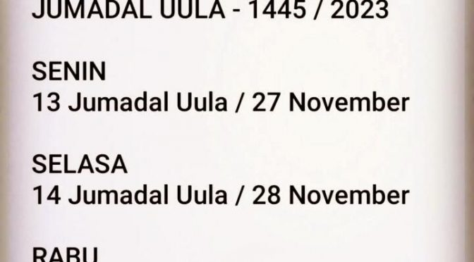 Display Picture Dakwah Jadwal Puasa Ayyaamul Biidh – Jumadal Uula 1445 Image November 14, 2023 BBG Al Ilmu MALAM RABU – 01 Jumadal Uula 1445 Raihlah pahala dan kebaikan dengan membagikan link kajian Islam yang bermanfaat ini, melalui jejaring sosial Facebook, Twitter yang Anda miliki. Semoga Allah Subhaanahu wa Ta’ala membalas kebaikan Anda.0sharesFacebook0Twitter