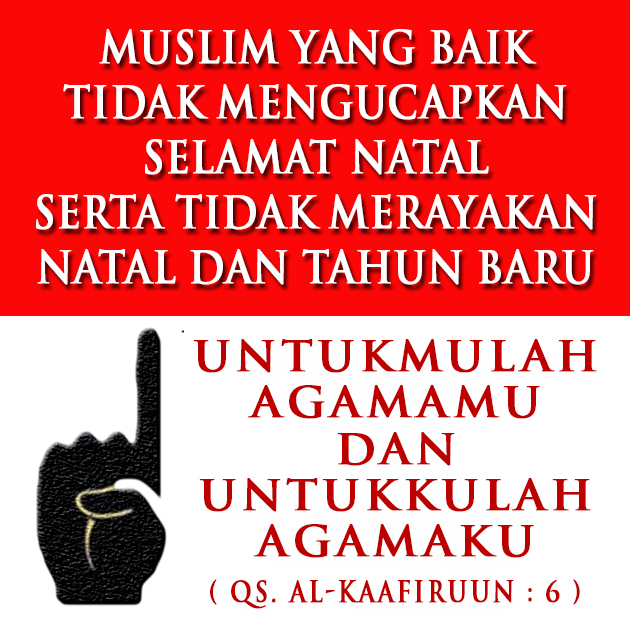“Hai orang-orang kafir. Aku tidak akan menyembah apa yang kamu sembah. Dan kamu bukan penyembah Tuhan yang Aku sembah. Dan Aku tidak pernah menjadi penyembah apa yang kamu sembah, Dan kamu tidak pernah (pula) menjadi penyembah Tuhan yang Aku sembah. Untukmu agamamu, dan untukkulah, agamaku.” (QS. Al Kafirun; 1-6).
