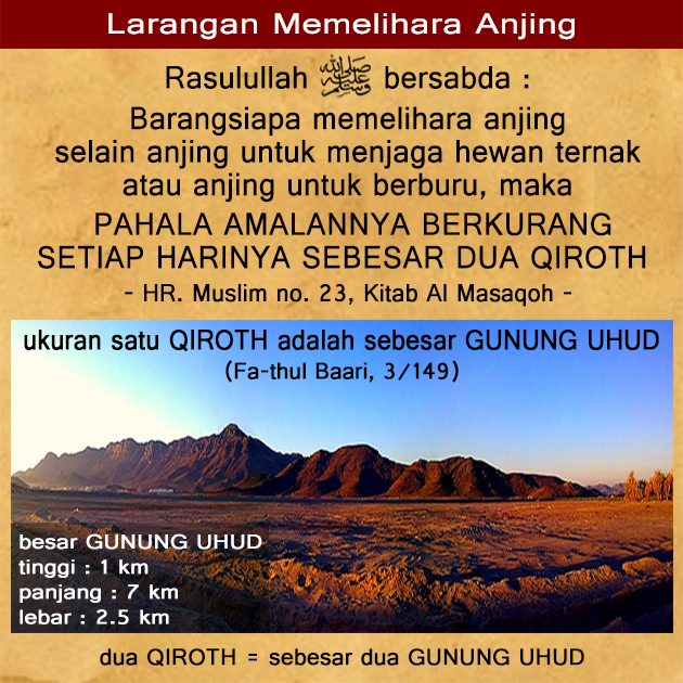 Syaikh Muhammad bin Sholeh Al Utsaimin rohimahullah mengatakan, “Adapun memelihara anjing dihukumi haram bahkan perbuatan semacam ini termasuk dosa besar –Wal ‘iyadzu billah–. Karena seseorang yang memelihara anjing selain anjing yang dikecualikan (sebagaimana disebutkan dalam hadits-hadits di atas, pen), maka akan berkurang pahalanya dalam setiap harinya sebanyak 2 qiroth (satu qiroth = sebesar gunung Uhud).” (Syarh Riyadhus Shalihin, pada Bab “Haramnya Memelihara Anjing Selain Untuk Berburu, Menjaga Hewan Ternak atau Menjaga Tanaman”)